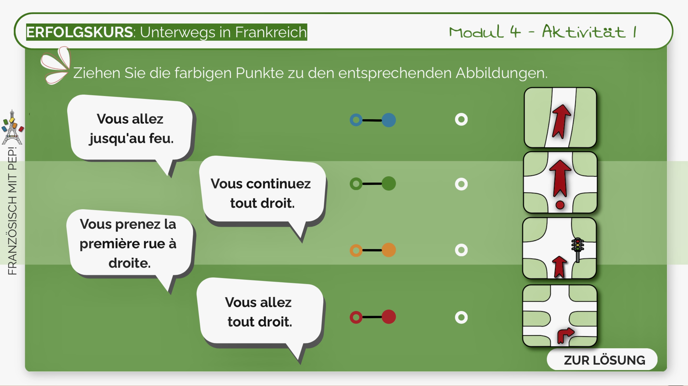 Lesen Sie z. B. den Satz „Vous prenez la première rue à droite“ und sehen Sie dazu ein passendes Bild. Hören Sie dann die Audioaufnahme.
